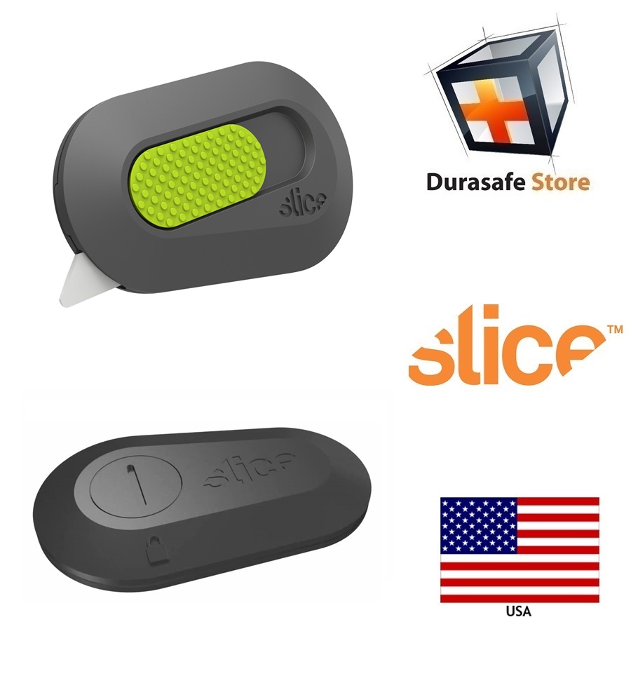 Auto-retractable pocket cutter with replaceable ceramic blade. Patent-pending handle, rubberized slider button limits the amount of exposed ceramic-blade to further reduce injuries. Automatically retracts back into the housing for added safety when slider button is released. High-tech double-sided #S3 ceramic blade (SKU#10404) is hand sharpened and designed to reduce injuries by incorporating a safer rounded-tip. Sharpness level lasts up to 10x longer than steel, resulting in less blade changes and less potential injuries. Small convenient size slips in pocket without worry of exposed blade. Built-in magnet. SKU#10514
