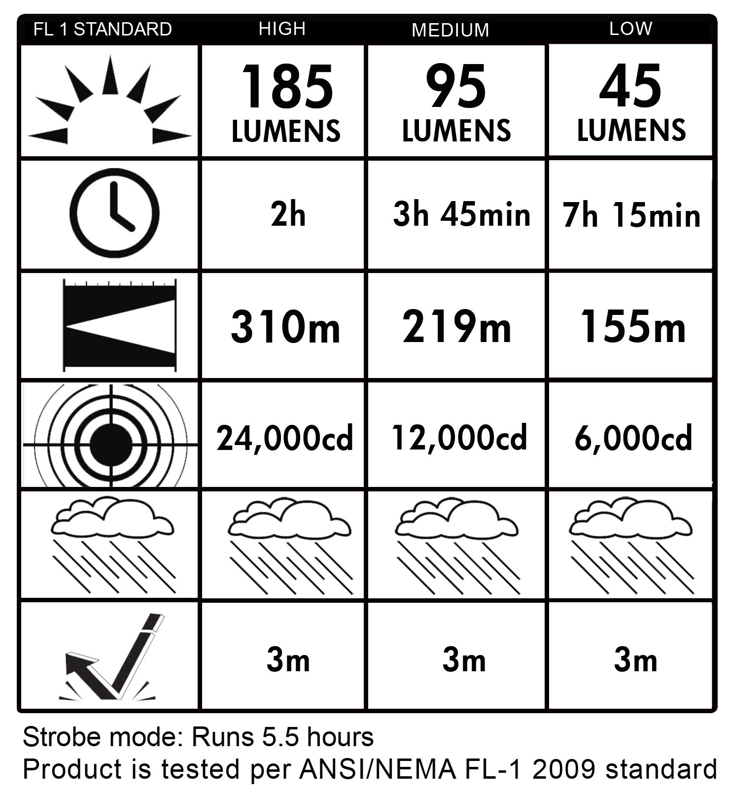• Runtime: High ? up to 2 hrs.; Medium ? up to 3.75 hrs.; Low ? up to 7.5 hrs.; Strobe ? up to 5.5 hrs.
