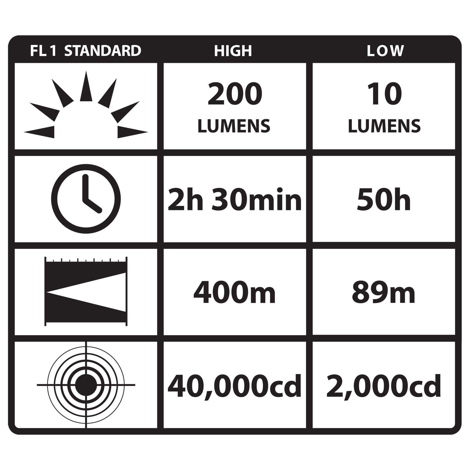 Low : 2000 candela peak beam intensity, 10 Lumens, 50 hours runtime