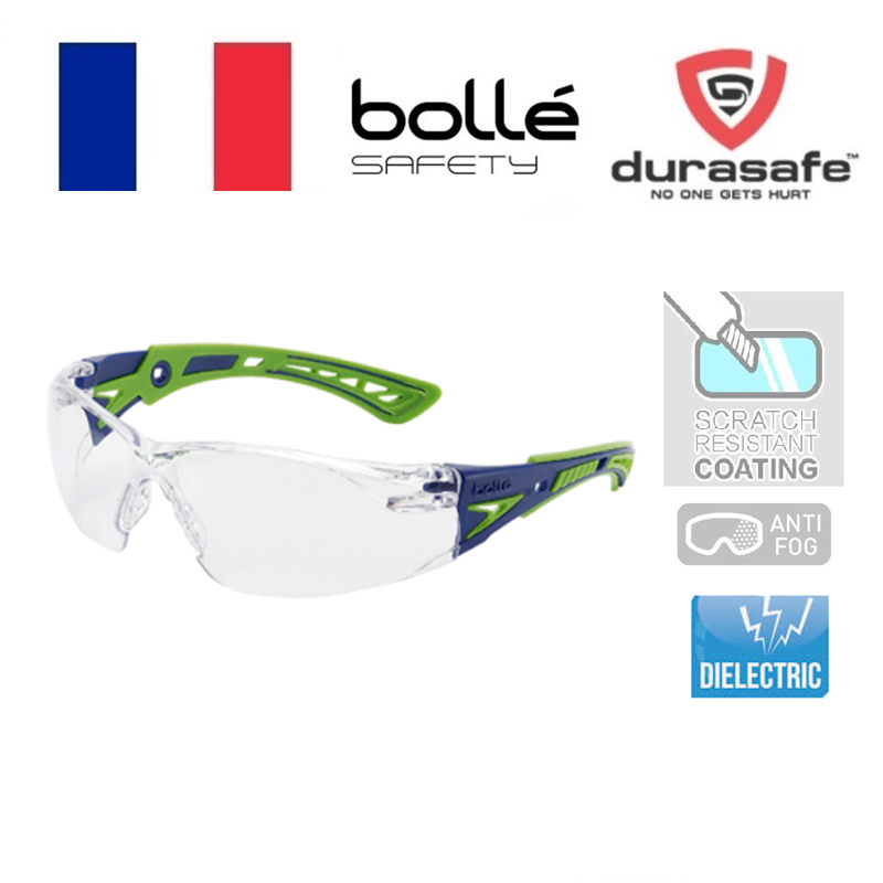 Rush+ safety glasses feature an ultra-sporty design, with co-injected, highly flexible bi-colored temples. Also features upper protection with a non-slip bridge. Lenses are anti-fog and anti-scratch coated on both sides and platinum coated.
