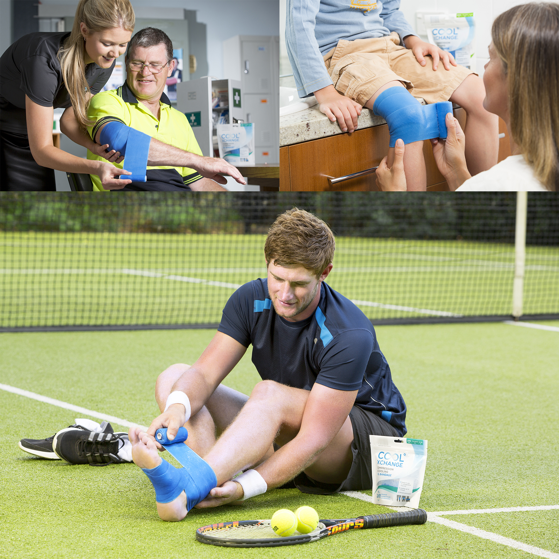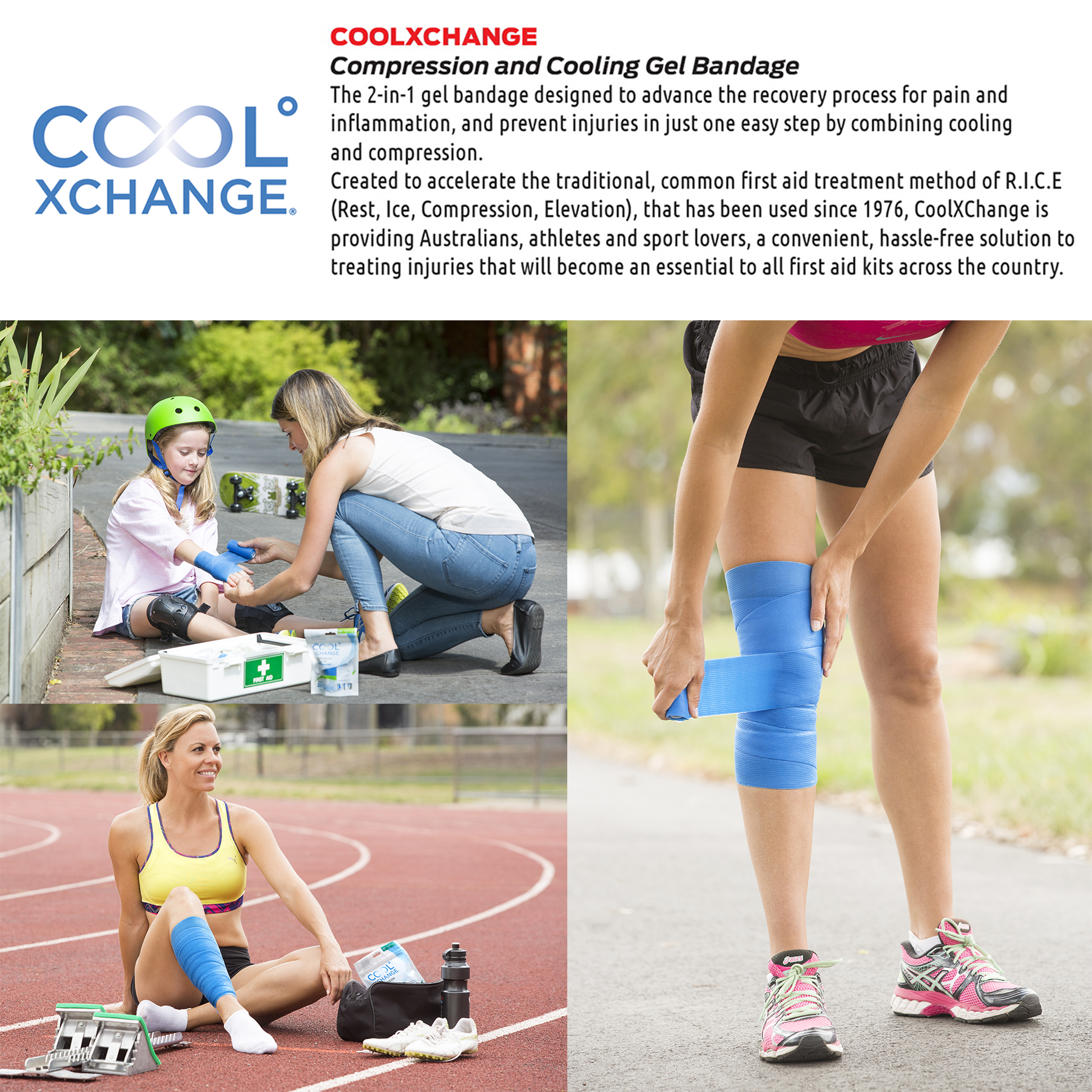 CoolXChange Gel Bandage combines the cooling and compression stages of R.I.C.E methodology, providing a convenient and effective 2 in 1 solution. When CoolXChange is applied, evaporative cooling along with elastic compression reduces the amount of blood flow and heat in the injured area, minimising pain and swelling.