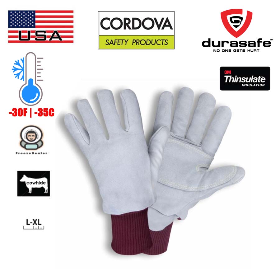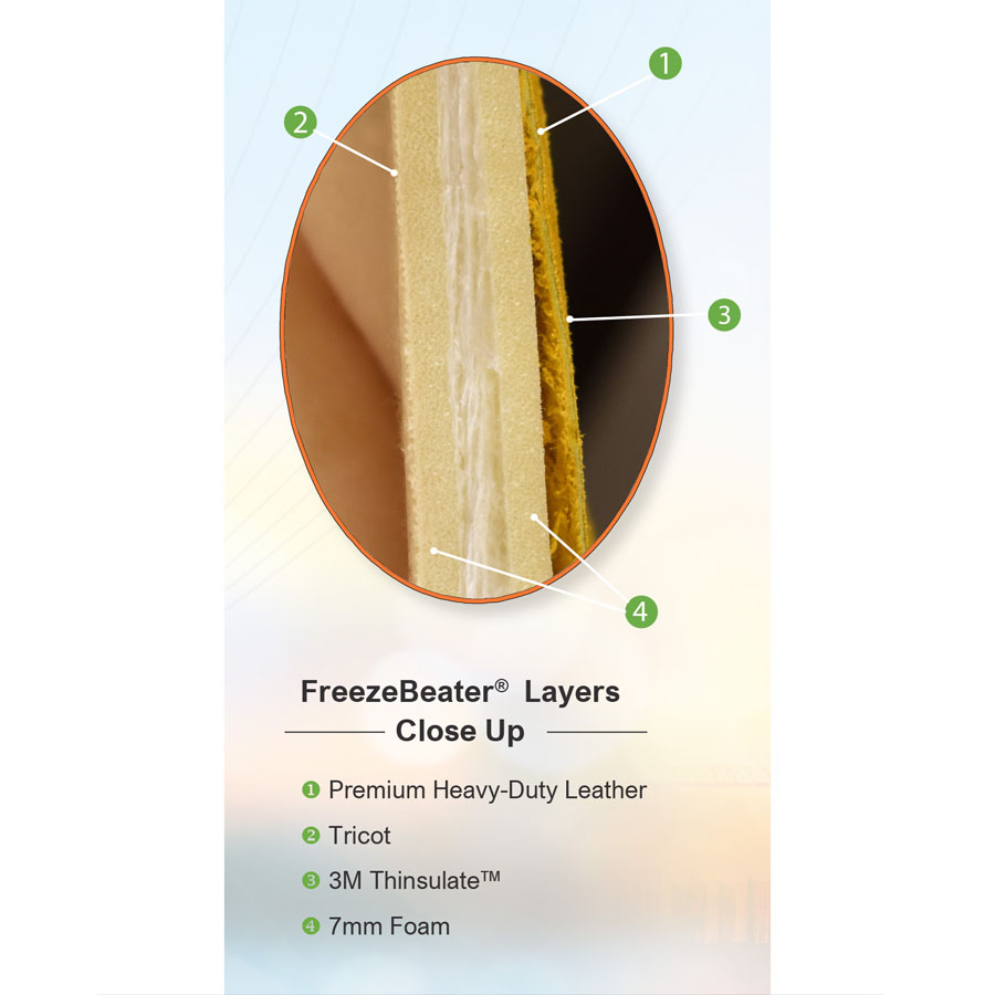 Featuring 3M Thinsulate™, the warmest thin insulation on the market, CORDOVA brand FreezeBeater® gloves keep working hands warm and toasty even in the coldest conditions. They feature premium, heavy-duty leather and nylon knit wrists, a triple-layer lining, and continuous pull tabs. The three-layer linings consist of Tricot, Thinsulate® and 7 mm foam.
