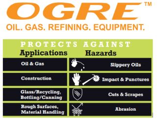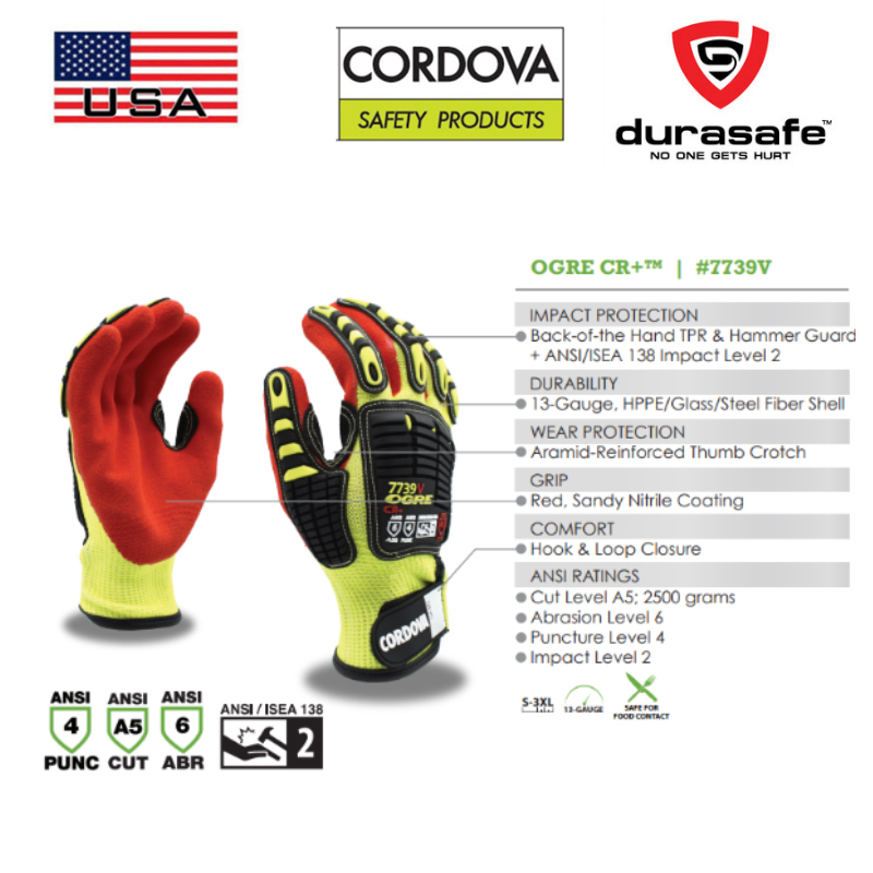 OGRE® stands for Oil, Gas & Refining Equipment. The CORDOVA SAFETY PRODUCTS OGRE® brand gloves are designed for those down and dirty jobs that require gripping power and impact protection. This OGRE-CR+™ cut resistant glove protects against a wide-range of hazards. The CR in OGRE-CR+ stands for Cut-Resistant, as this glove offers outstanding protection with an A5 cut level, as well as Abrasion Level 6 and Puncture Level 4 protection, and Level 2 Impact protection. It features a 13-gauge, hi-vis, high-performance polyethylene (HPPE)/glass fiber shell, thermoplastic rubber (TPR) protectors for impact resistance, and a reinforced thumb crotch for increased durability. It also provides interior foam palm padding for better comfort and a red, sandy nitrile coating.