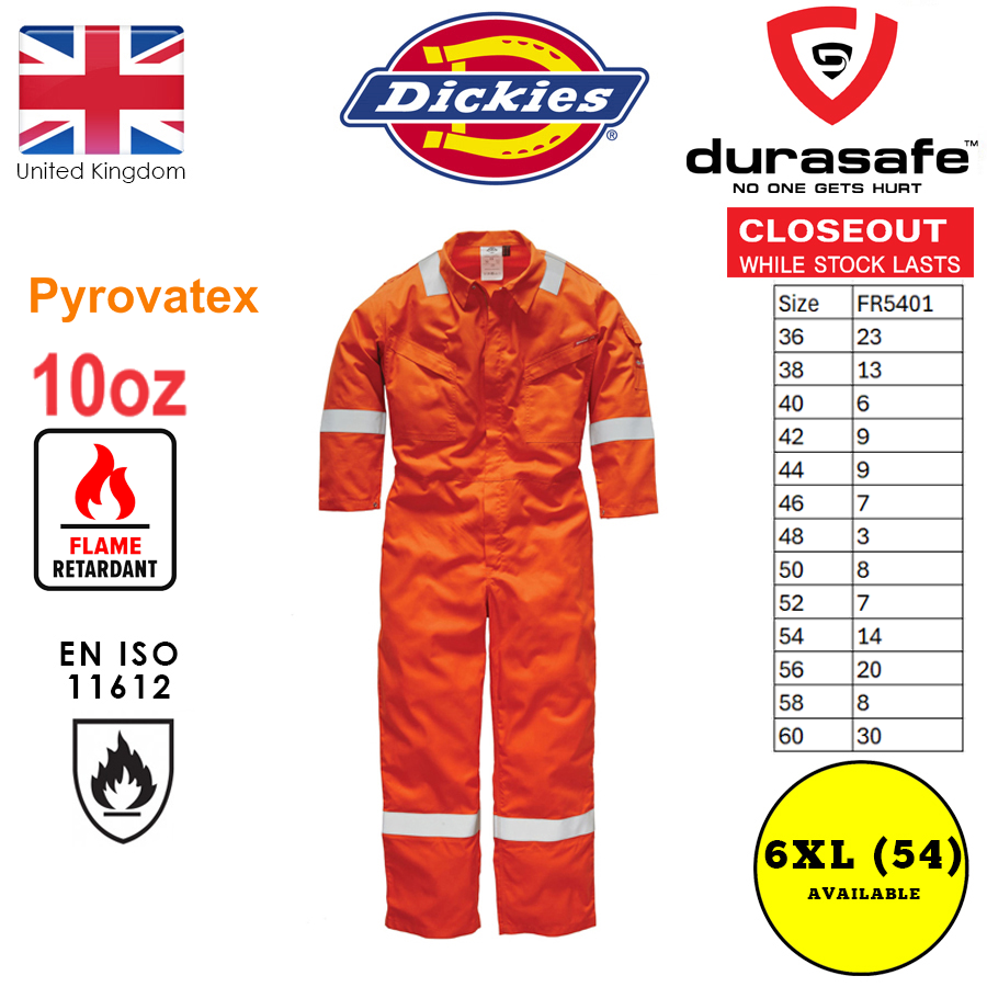 These lightweight flame retardant overalls have replaced the FR5055, which used to be the best selling Dickies FR Overall. This updated design offers maximum protection against heat and flame with it’s cotton being Pyrovatex® FR treated. Additionally the garment features flame retardant reflective tape across the shoulders, arms & legs and an extended collar area for throat/neck protection. There are side access pockets, which will allow entry to garments worn beneath this coverall and additionally there are two back pockets and a rule pocket.
