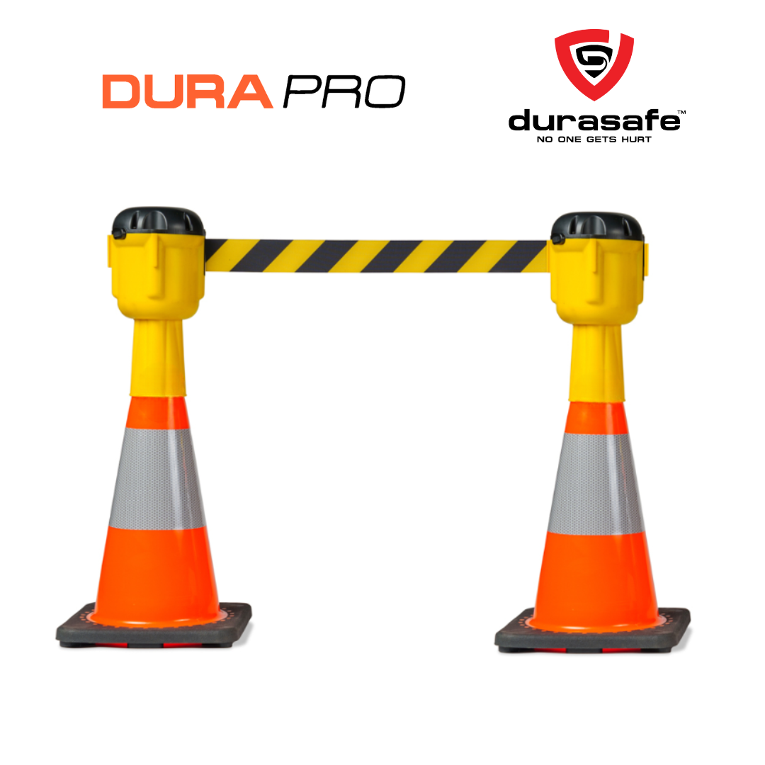 The DURAPRO RoadSafe W-TCB9 Cone Mounted Retractable Barrier System is designed for fast, effective, and flexible crowd and traffic management. Featuring a 9-meter retractable belt in a high-visibility black and yellow color pattern, this barrier system is ideal for construction sites, road maintenance, parking lots, and events requiring quick setup and removal.