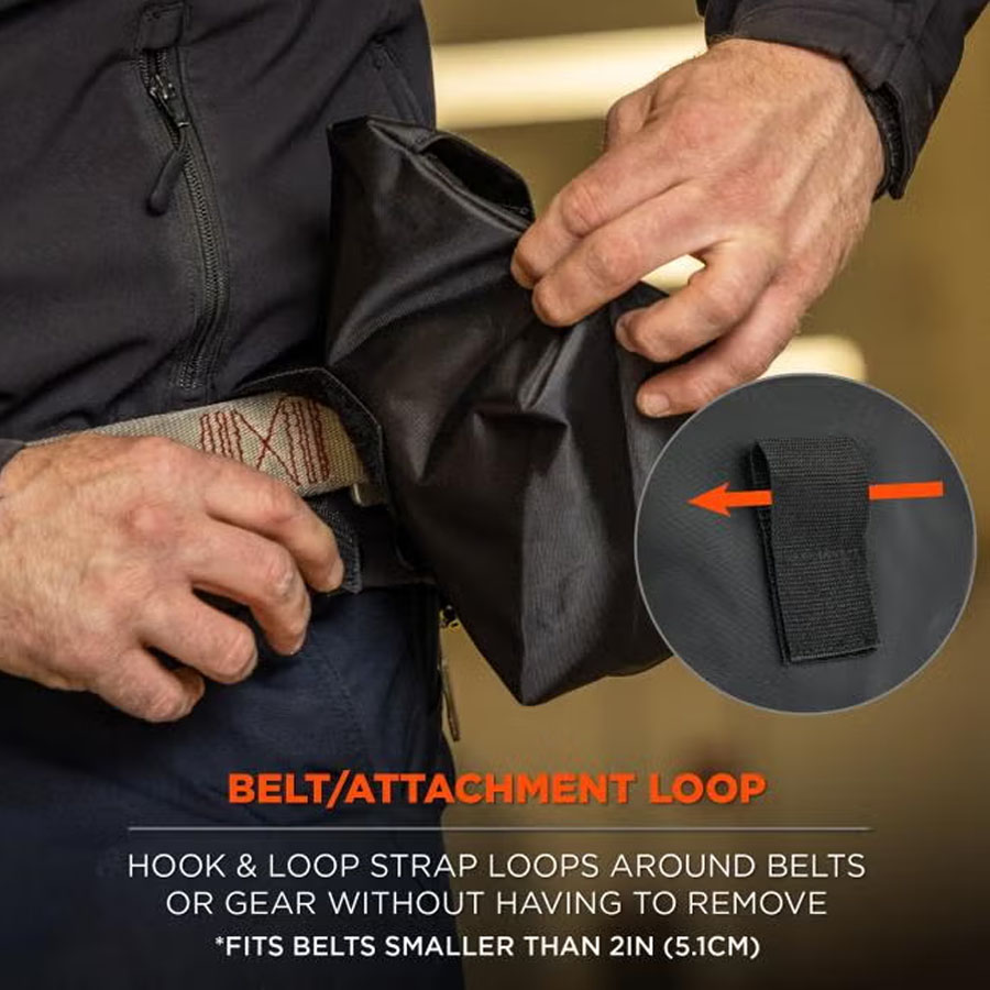 The belt loop design features a hook & loop strap, making it easy to attach or detach the bag without having to remove belts or unclip anchoring locations. Simply undo the loop, wrap around and refasten to keep respirators within reach, both increasing safety and improving compliance. The hook & loop closure easily opens with one hand for immediate access.