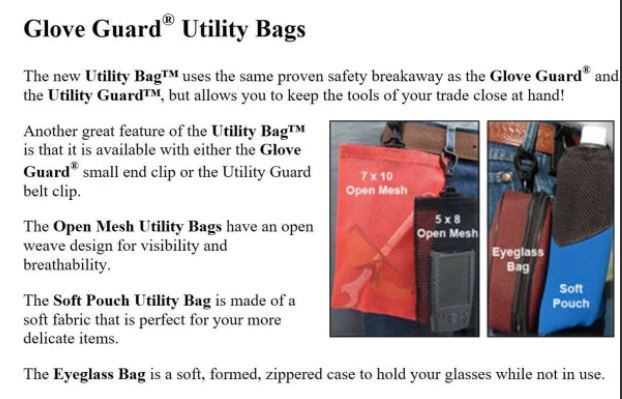 The new Utility Bag? uses the same proven safety breakaway as the Glove Guard? and the Utility Guard?, but allows you to keep the tools of your trade close at hand!