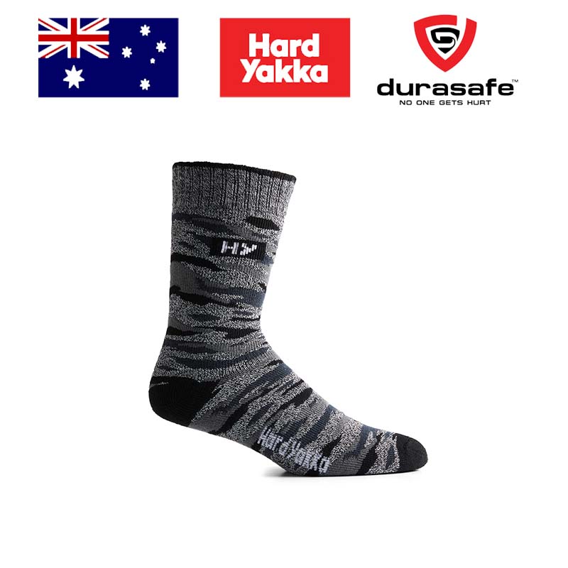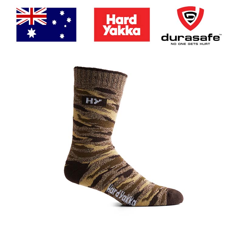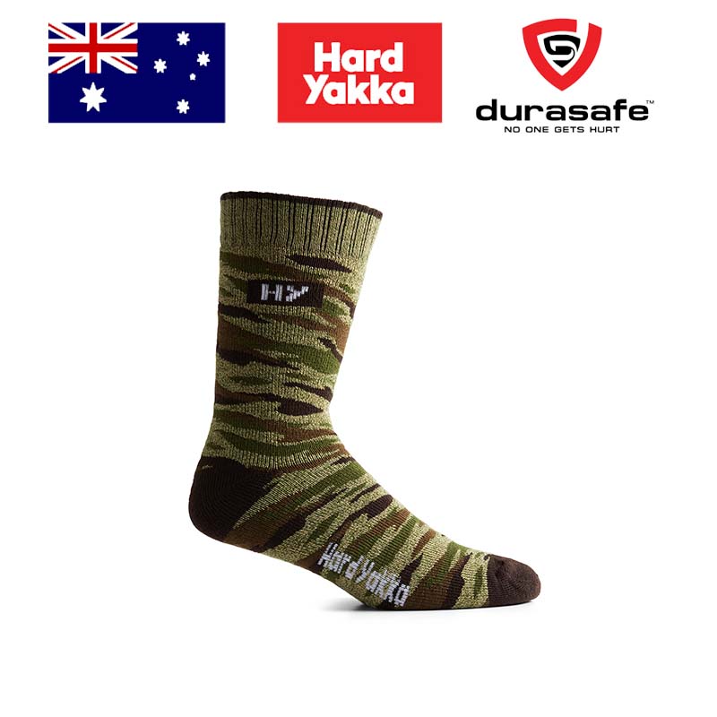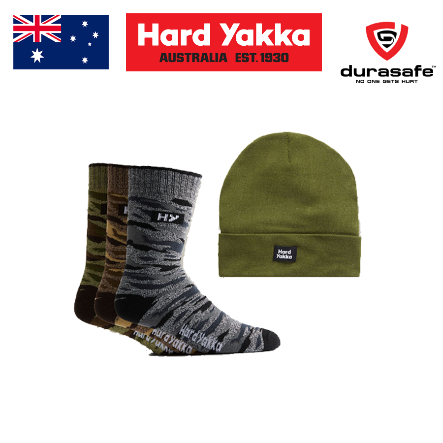 This socks + beanie bundle gives you an easy way to keep warm and comfortable at work. The socks are a Camo design and the beanie is a matching military green. Both are made with 85% recycled polyester. Stock up today.
