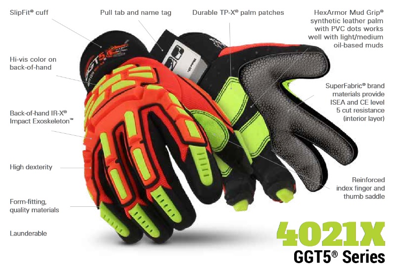 Introducing the Hexarmor 4021X Gator Grip GGT5 MUD Oil & Gas Industry Impact, Cut & Puncture Resistant Glove Orange Mud, the most complete glove for the oil and gas industry. Gator Grip Technology® is a design platform that combines high performance materials engineered to provide industry-leading cut, puncture, impact protection, and strong grip in light/medium oil situations.
