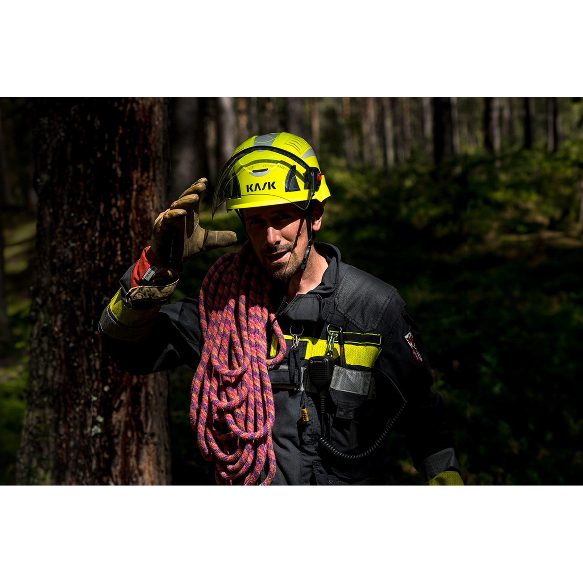 KASK developed a new helmet certified under 3 key European helmet standards; Wildland Firefighting, Technical Rescue, and Mountaineering, with a design grounded in 3 core KASK attributes: safety, comfort, and design. This challenged the team to address the unique risk factors encountered in emergency response applications including impact absorption, durability, and compromised environments, whilst addressing helmet stability, comfort, and usability. The Quantum helmet embodies these objectives — from the innovative, fire and chemical-resistant PC-PBT alloy exterior shell and high density EPS inner with thermoformed cover, through to the Adaptive Fit system that can be easily adjusted with gloved hands.