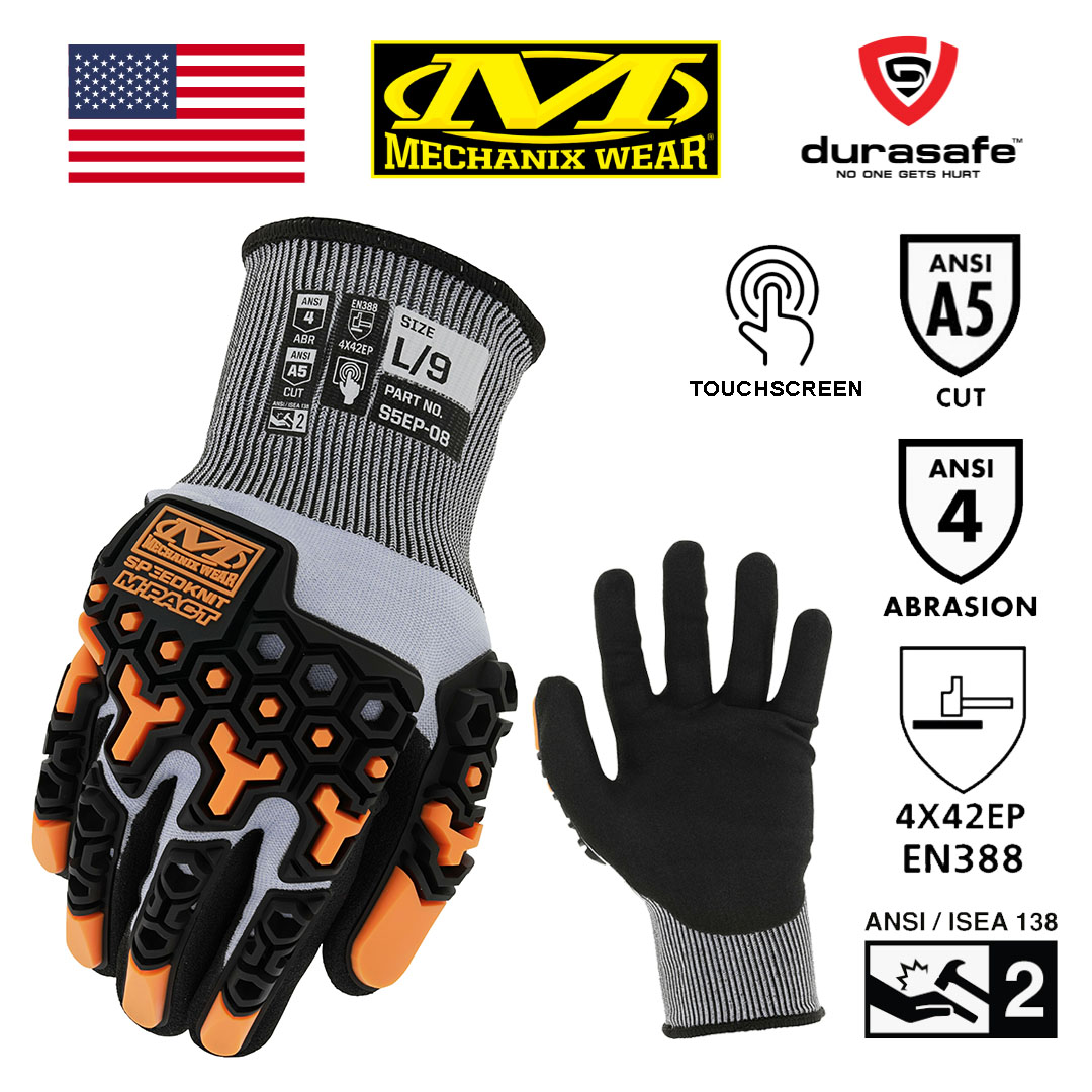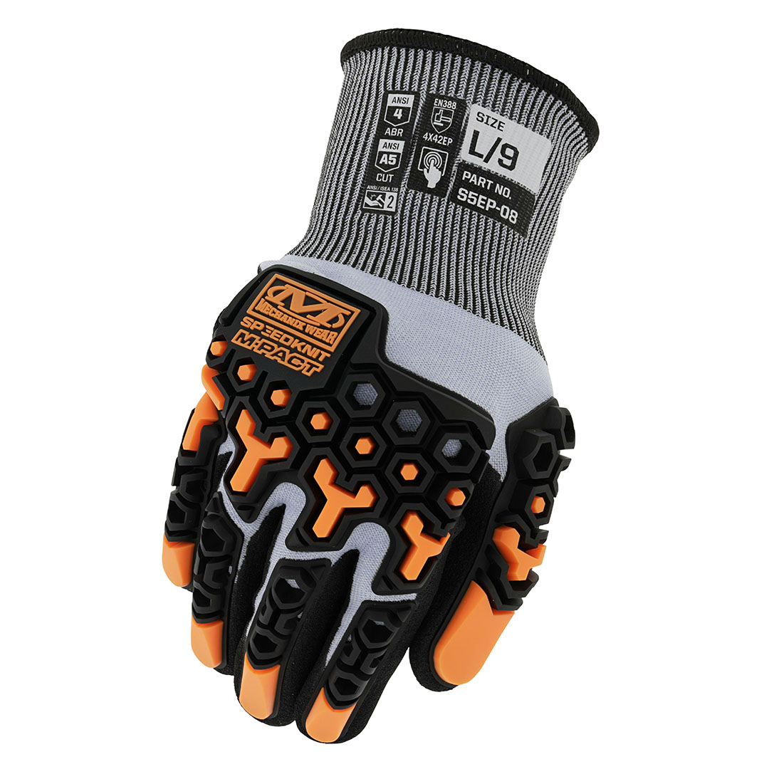 Our SpeedKnit™ M-Pact® S5EP08 is designed to protect working hands with a combination of functional impact resistance and high-dexterity cut performance. We use a machine-knit blend of 18-gauge HPPE and Tungsten steel coated with sandy nitrile to achieve ANSI A5 cut resistance. Our ergonomically designed TPR is sonic welded for a seamless fit and ANSI Level 2 impact resistance.