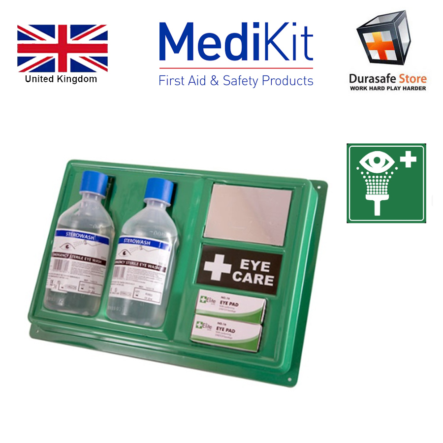 Medikit Wall Mounted Eye Wash Station- complete with 2 x 500ml eye wash solution, mirror and 2 x no.16 sterile eye pads ( 370 x 265mm).