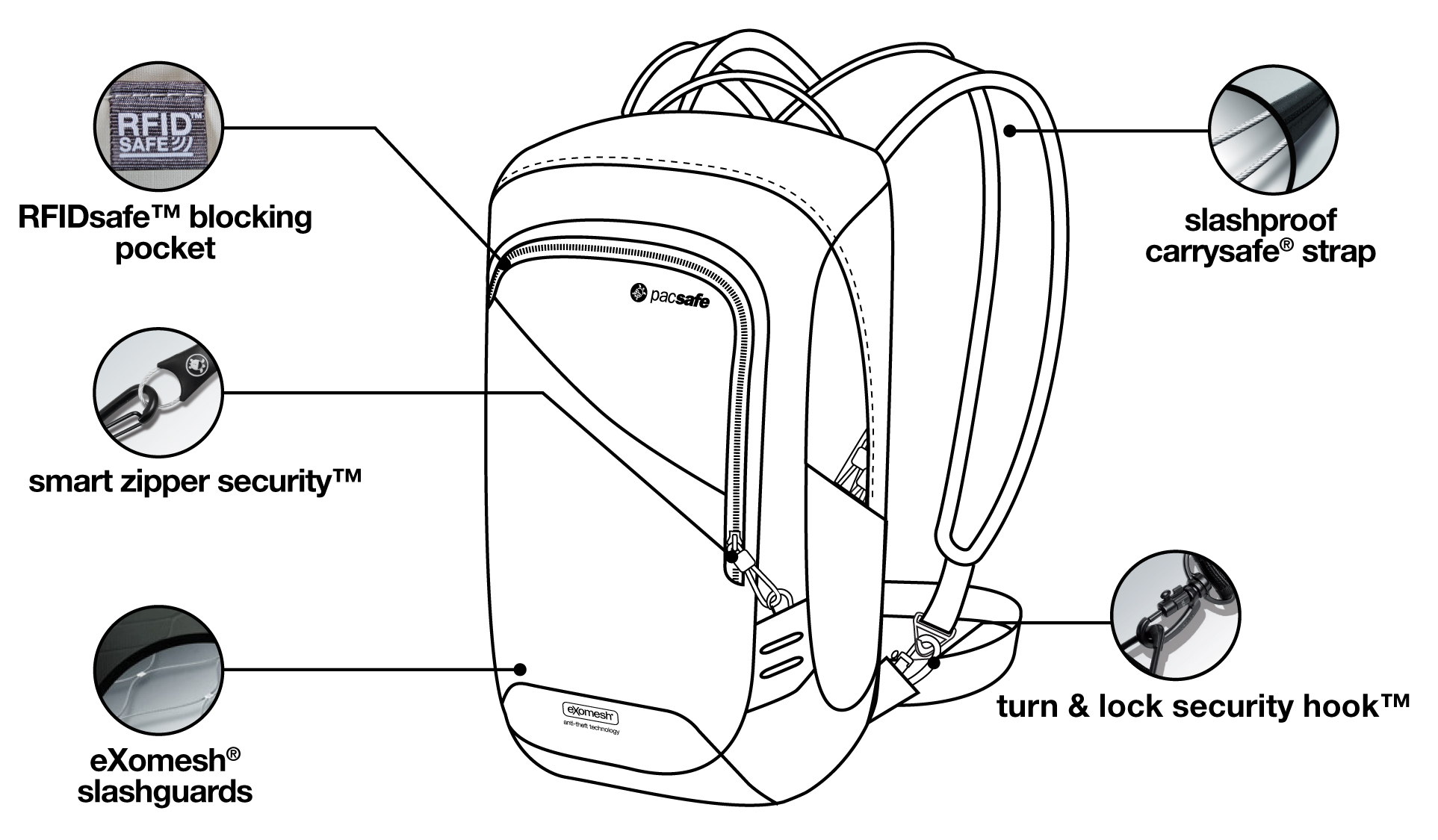 The 15L daypack is perfect for adventures overseas or at home complete with a padded sleeve to fit a 13? MacBook. In addition to offering 5 anti-theft features, the 15L daypack is also built for comfort with a padded molded back support, padded shoulder straps, sternum strap.