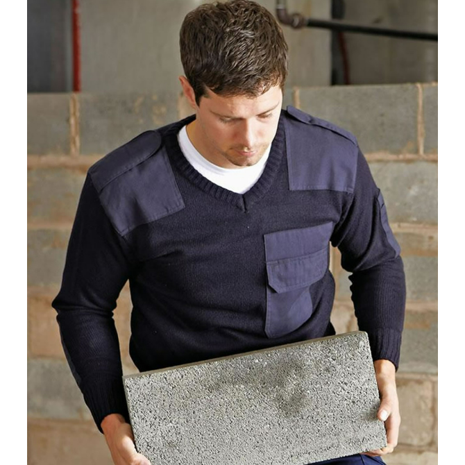 A long time favourite with the public services, this 100% acrylic sweater has polyester cotton shoulder and elbow patches for extra reinforcement. Features include Hook & Loop fastening shoulder epaulette and a sleeve pen pocket.