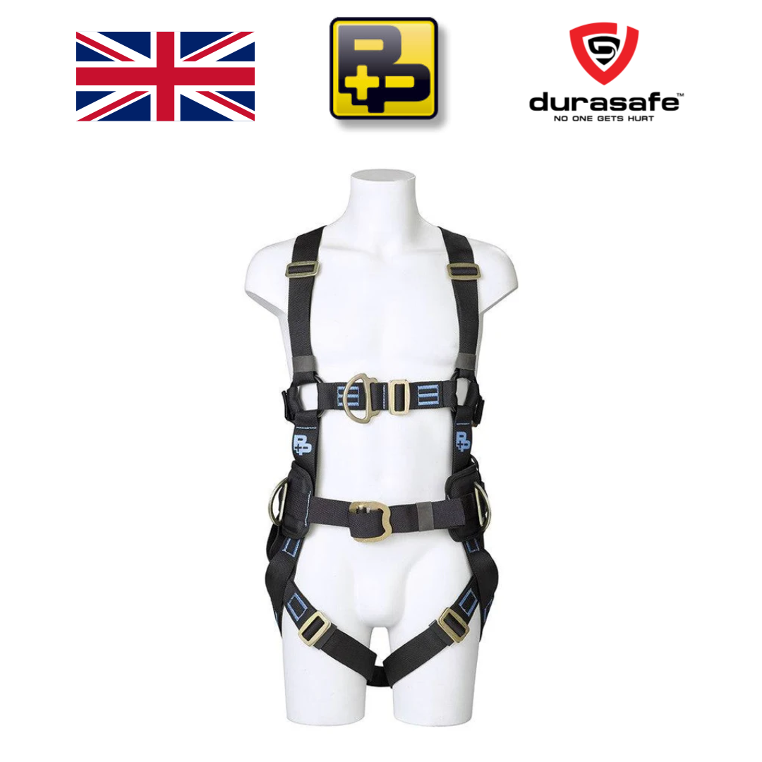 Four-point, fall arrest harness, with 3 bar slide and rectangular link, leg and chest connections. Includes an integral work positioning belt with a large roller buckle and adjustable length shoulder straps with a 3-bar buckle. The chest strap on this harness is full, providing an exceptionally secure configuration which increases the distribution of load when using the front “D” ring—polyester webbing featuring a water repellency coating & carbon steel, heat-treated and zinc-plated metal fittings.