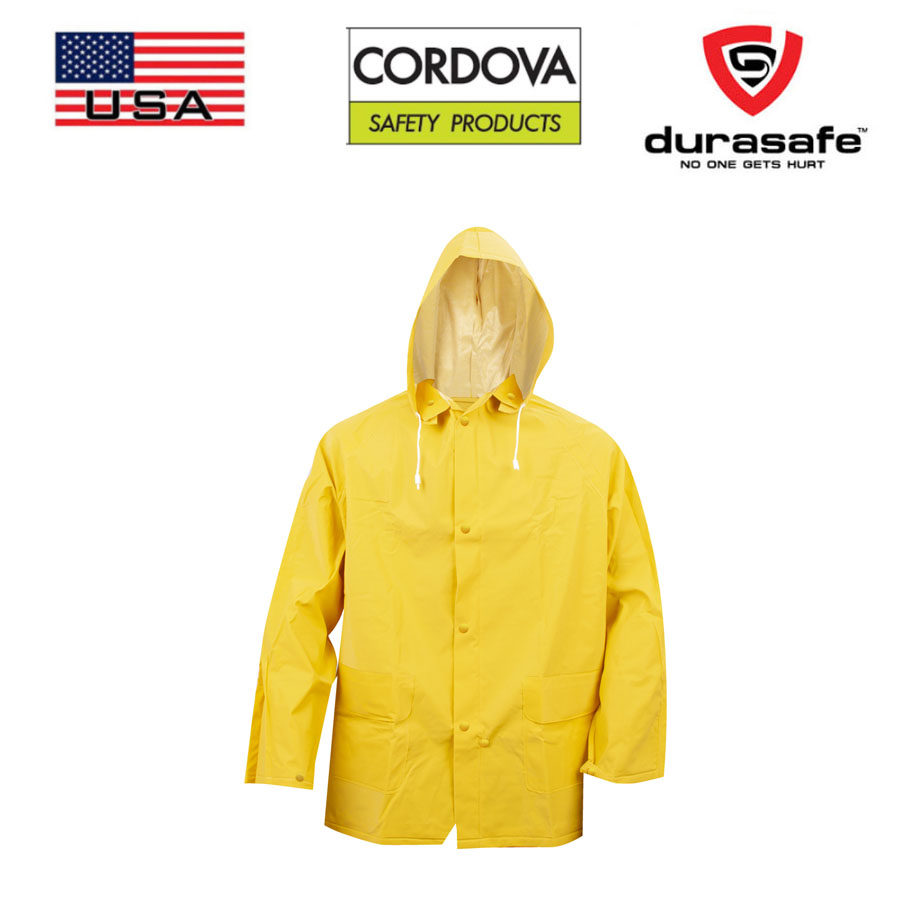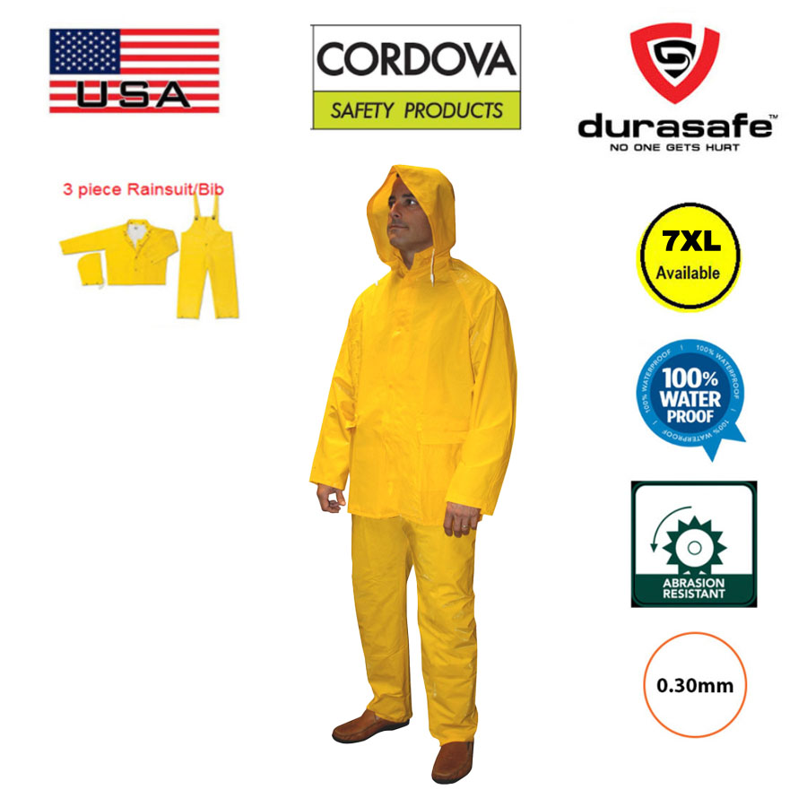 Stratus 3-Piece Rainsuit is constructed of .30mm PVC on polyester and includes a jacket, detachable hood and bib overall. Jacket features a snap front and snaps at the wrists. Overall features suspenders, a snap fly and snaps at the ankle hem. Suit is ideal for use in construction work.