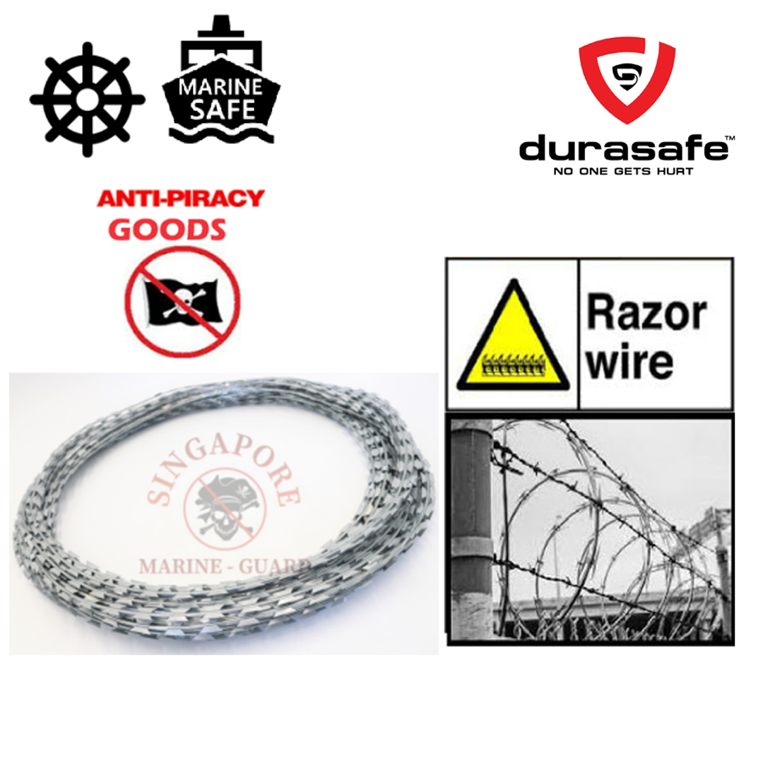 A concertina configured galvanized steel wire used for outer boundary fencing on the ship’s deck to defend ships from the vandals, like pirates. The razor wire prevents any intruders from penetrating by piercing or gripping them. Two patterns of the loop are available. Single Loop or Crossed Loop, and also standard diameter is available from 900mm. Standard coil length when extended is 7mtr to 10mtr, and they can be lengthened by connecting clips.