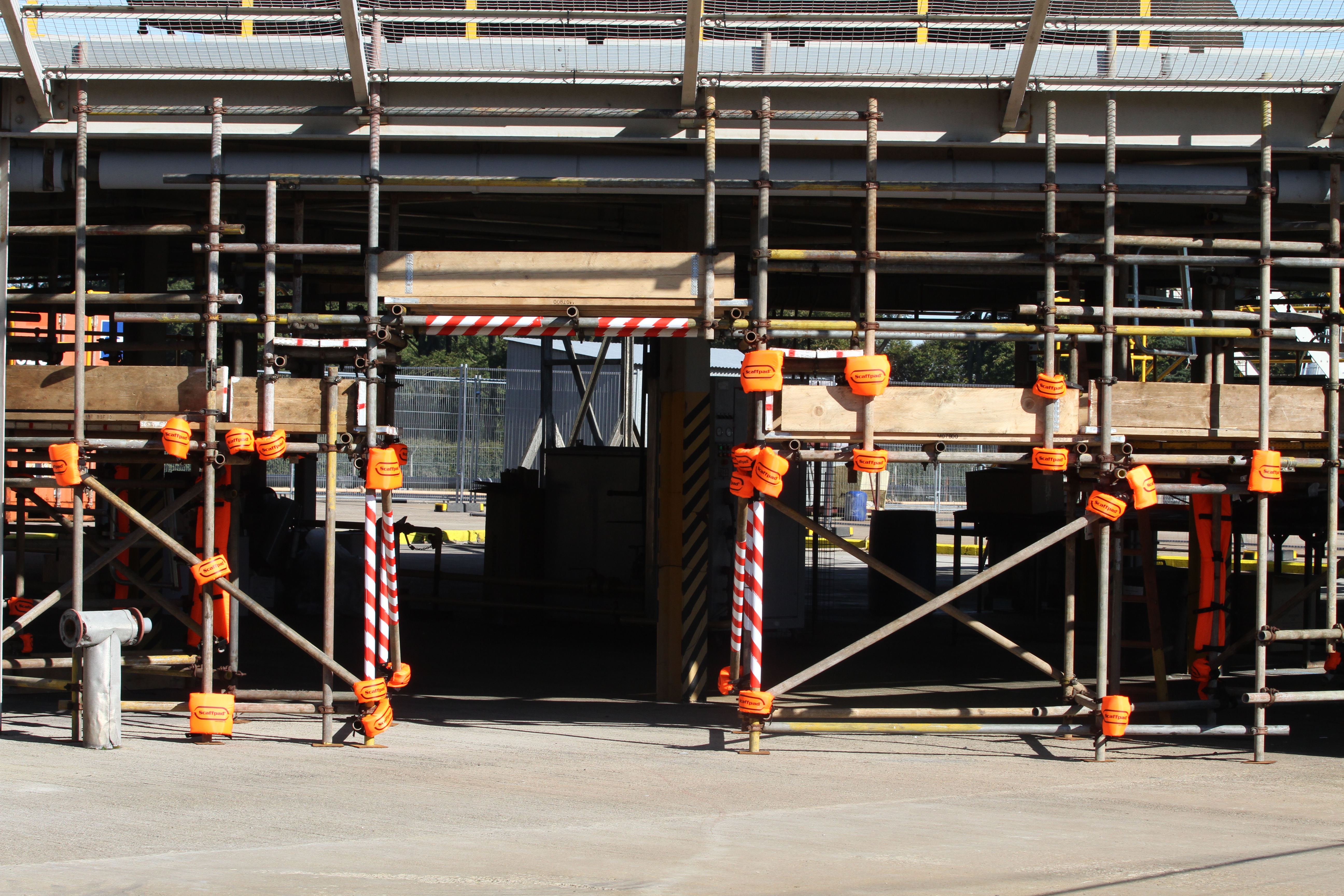 The foam pads prevent injuries caused by personnel walking into protruding scaffolding joints.