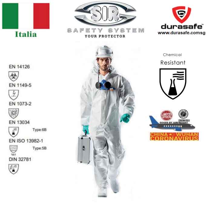 Coverall designed for protection against radioactive contamination from particles. Made with reinforced four-thread seams in high density polypropylene, coupled with a breathable microporous film, weight 63 gr/mq. It provides protection against dusts and partial protection against liquids; antistatic properties. It features a concealed zipper closure with adhesive flap and elastic hood, cuffs and ankles.