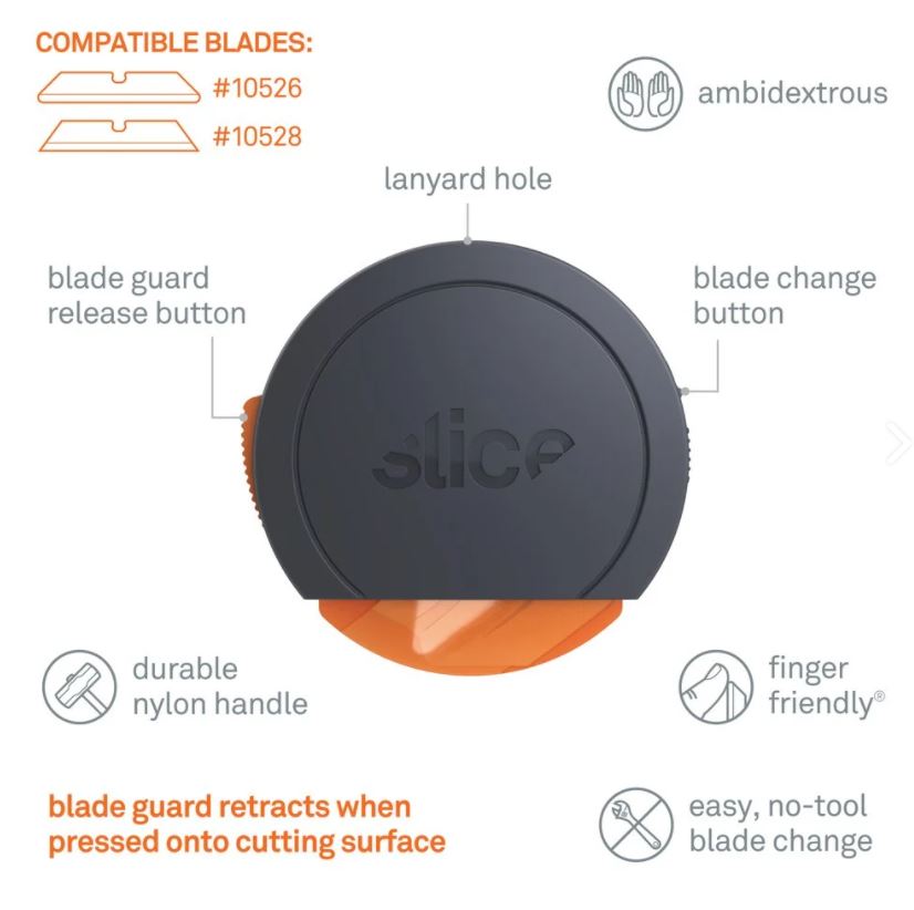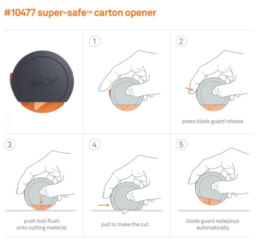 The Slice® Super-Safe™ Carton Opener is a unique knife with a design that’s ideal for those with dexterity issues or anyone wearing work gloves. Its large, circular handle fits comfortably in the palm for straight, flush cuts. Press the orange button with an index finger to unlock the blade guard. Then, press the tool down, flush, onto the cutting surface and pull to make the cut. Once the 10477 is no longer held against the cutting surface, its blade guard redeploys, keeping the user safe in the event of a slip.