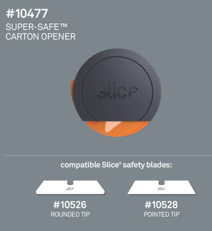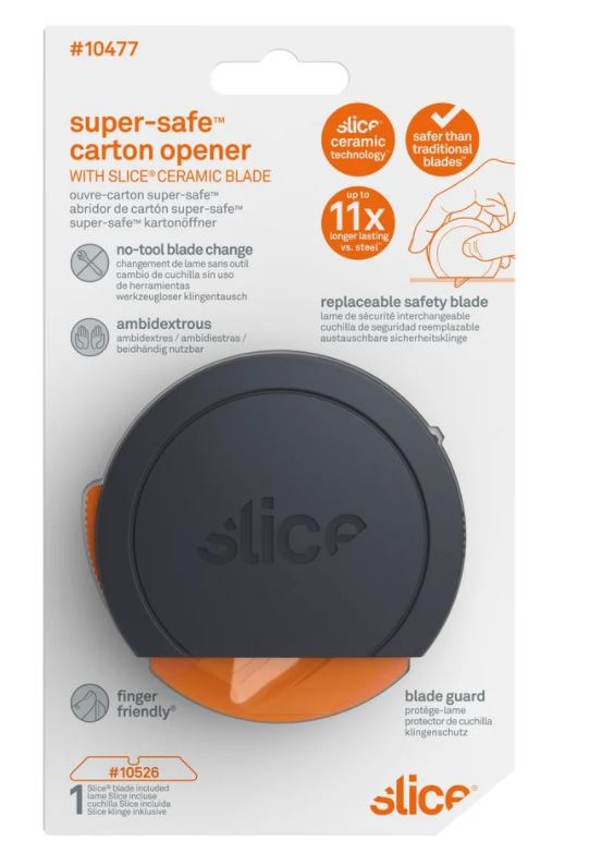 As with all Slice tools, the Super-Safe™ Carton Opener features a finger-friendly® blade that’s safe to the touch, cuts effectively, and lasts up to 11 times longer than comparable steel blades. The installed rounded-tip blade (10526) can also be replaced with an optional pointed-tip blade (10528) for materials that require puncturing to initiate the cut.