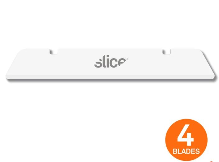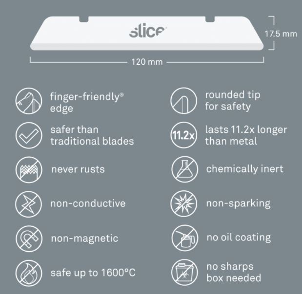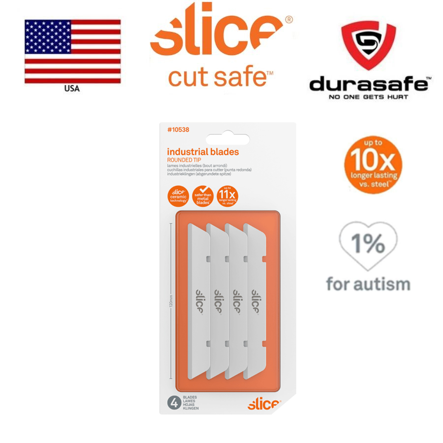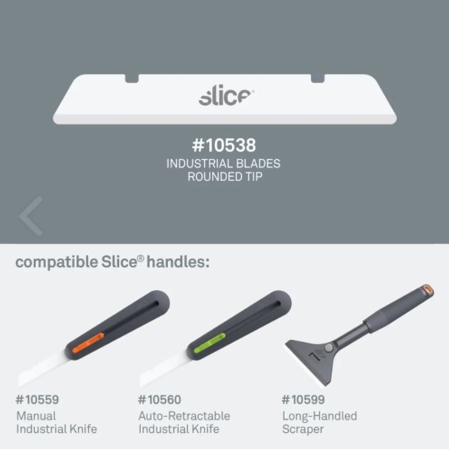 The Slice® 10538 Industrial Blade (Rounded Tip) comes installed in our industrial knives, which are intended to tackle deeper cuts into thick materials like insulation and foam. 10538 is also compatible with the upcoming 10599 Long-Handled Scraper. Total blade length is 12 centimeters (4.72 inches). Once installed in our 10559 or 10560 handles, the blade extends for a cutting depth of 7.6 centimeters (2.99 inches). The rounded-tip offers extra protection against accidental punctures, while our safer finger-friendly® edge is safer to touch than standard blades. As with all Slice blades, the 10538 Industrial Blade is non-magnetic, non-sparking, non-conductive, chemically inert, and never rusts.