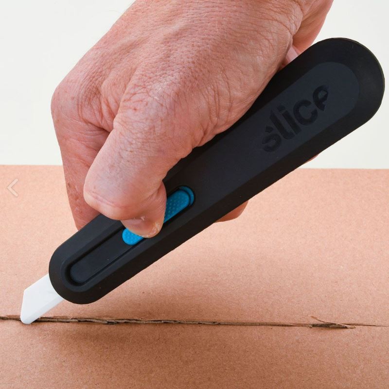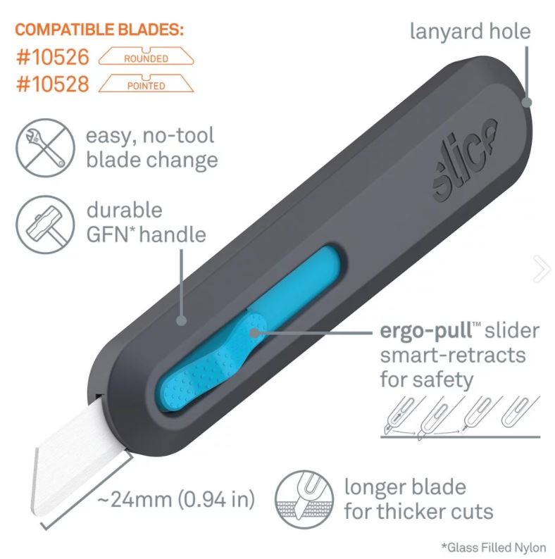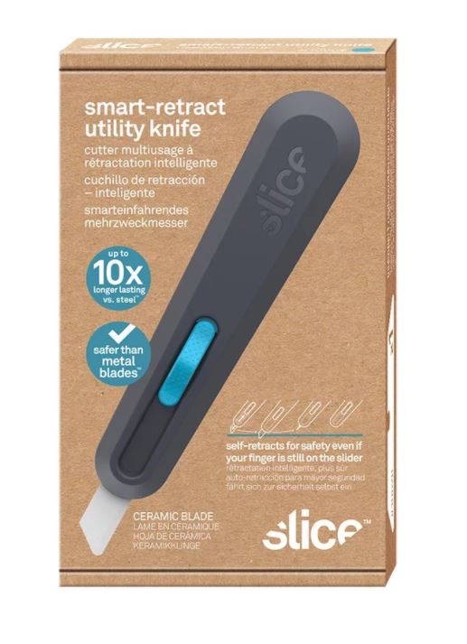 The Slice 10558 Smart-Retracting Utility Knife features our two newest innovations: Smart Retract technology and the Ergo Pull™ slider. This is our most advanced safety utility knife with multiple precautions to keep you injury-free. Smart Retract pulls the blade back into its housing as soon as it loses contact with the cutting material, even if you still have your finger on the slider. Ergo Pull™ reduces strain allowing you to slide and cut in the same direction.