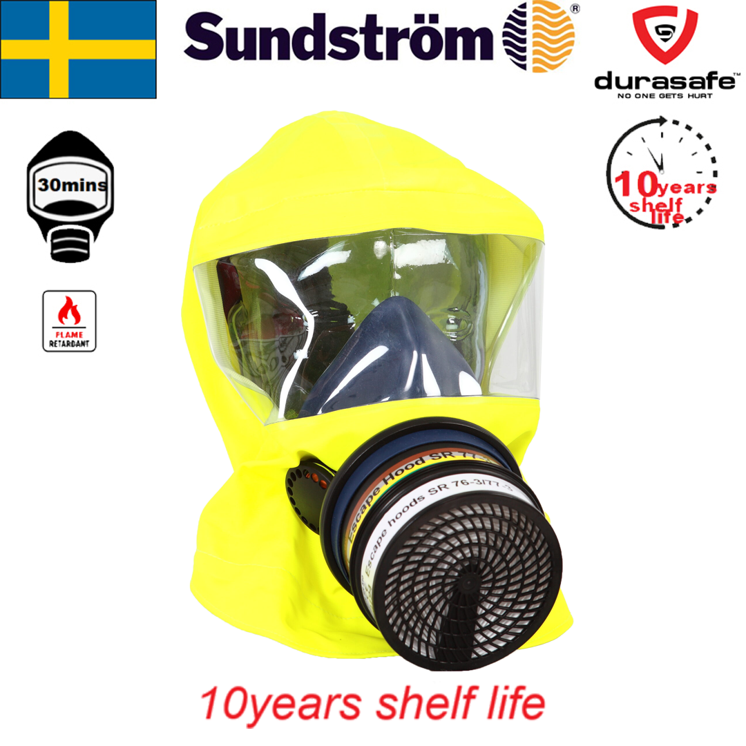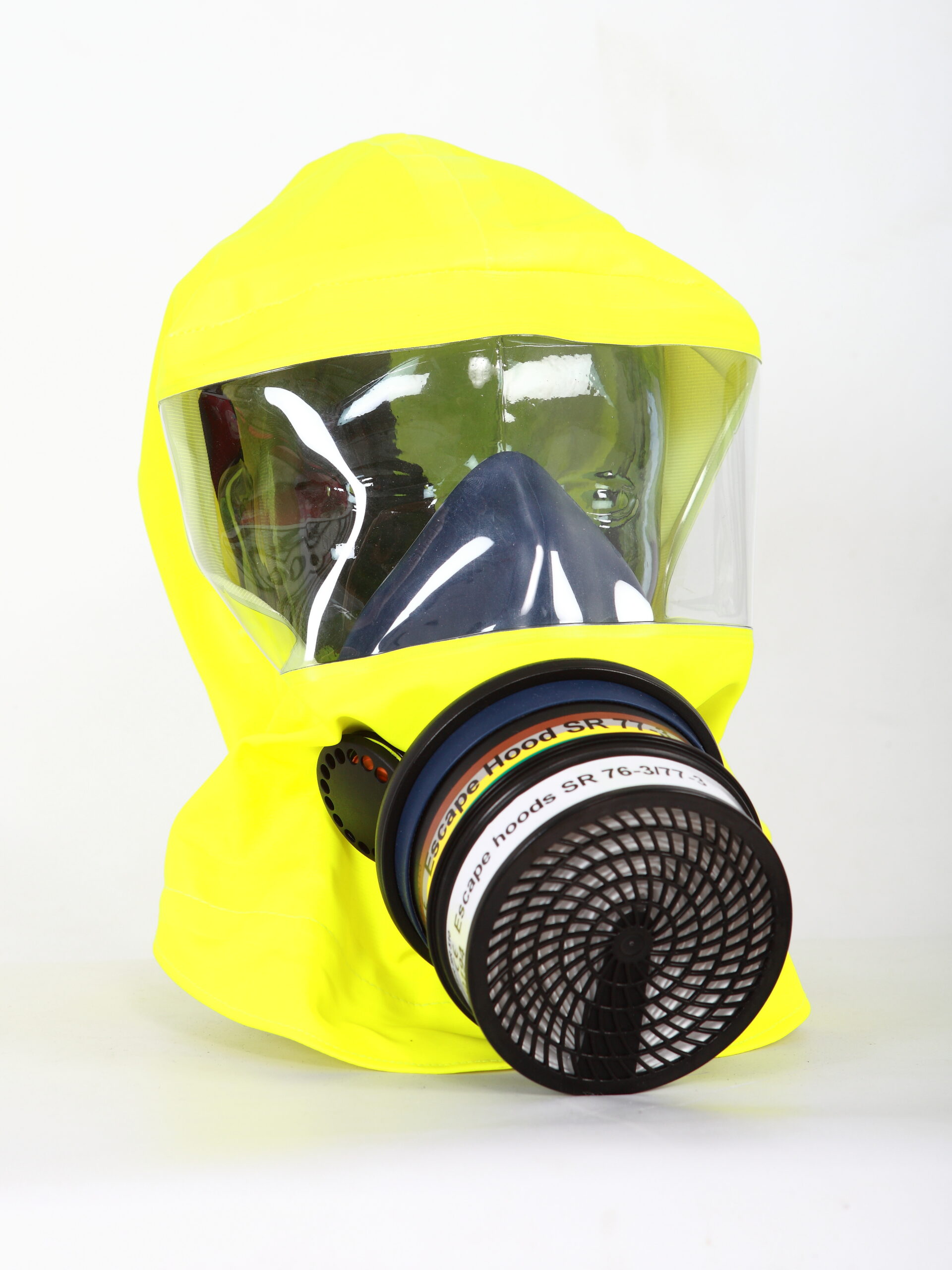 The SR 77-3 Escape Hood is a filtering respiratory protective device combined with a hood for self rescue in the event of a fire or a chemical emission accident. The hood is based on a Sundström silicone half mask, which is mounted in a hood made of flame-resistant material. The hoods are vacuum-packed in aluminum bags. The hood can be put on quickly and simply without prior adjustment. The hood is available in two sizes and fits most adults and teenagers. The hood is equipped with gas filter SR 331-2, ABEK1-CO and particle filter SR 510, P3 , and provides shorttime protection against carbon monoxide and other toxic gases and particles that may be emitted in a fire or in a chemical emission accident. A1, organic gases and vapours, such as solvents, with boiling points above 65 °C. B1, inorganic gases and vapours, such as chlorine, hydrogen sulphide and hydrogen cyanide. E1, acidic gases and vapours such as sulphur dioxide and hydrogen fluoride. K1, ammonia and certain amines, such as ethylene diamine.