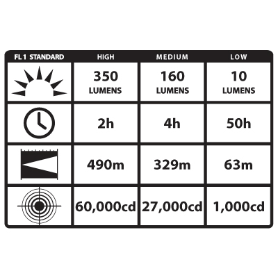 High – 60,000 candela peak beam intensity, 350 Lumens, 2 hour runtime