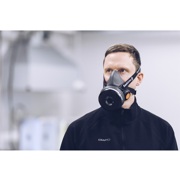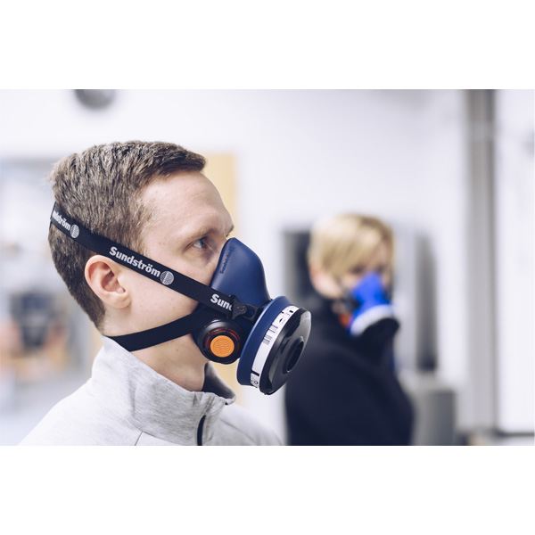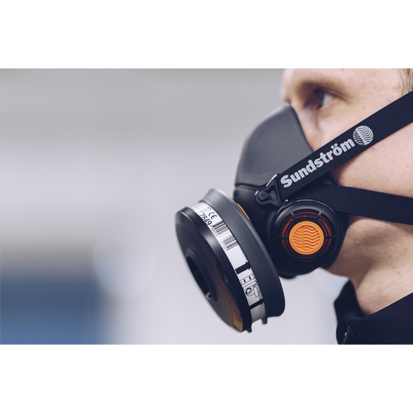The SR 100 half mask is made of silicone in three sizes, i.e. S/M, M/L and L/XL. The mask is equipped with two exhalation valves, which ensures very low exhalation resistance. The valve covers with partitions effectively protect the exhalation membrane against dust and paint mist. The material and pigment of the mask body are approved by FDA and BGA for foods, which minimizes the risk of contact allergies. The easily adjustable elastic head harness straps of the mask are designed as a V-shaped loop and have a large dished crown plate, which contributes towards a comfortable and safe fit. The mask is used either as a filtering device in combination with filters from the Sundström range, or in combination with the SR 307 compressed air attachment which then serves as a breathing apparatus with continuous flow for connection to a compressed air supply. A pre-filter holder is supplied.