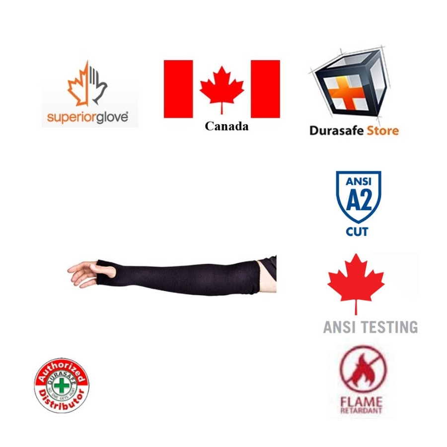 Superior double-layer black knit sleeves are made with cut- and flame-resistant Protex yarn that offers ASTM cut-level 2 protection and good heat, spark and flame resistance. These sleeves will not support combustion. Sleeves withstood 675 grams of cut force during testing. Soft and comfortable, the knit sleeve conforms to your arm contours for all-day comfort. Fully washable, they are available in three lengths, all with or without thumb holes. Fully sewn with Protex thread. Black color. Canadian made. Applications include oil and gas industry, metal handling, automotive, metal fabrication, welding.