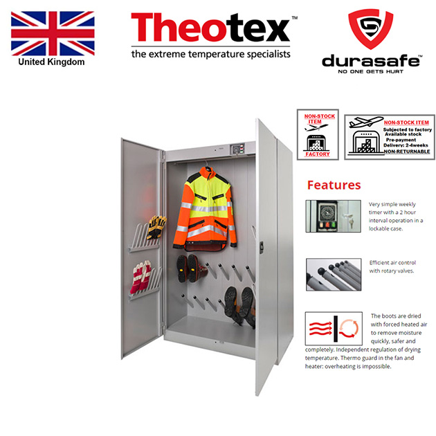 Efficient air control with rotary valves, drying arms for gloves, timer with power button & program selection, double-flap doors with rod-lock, fan.
