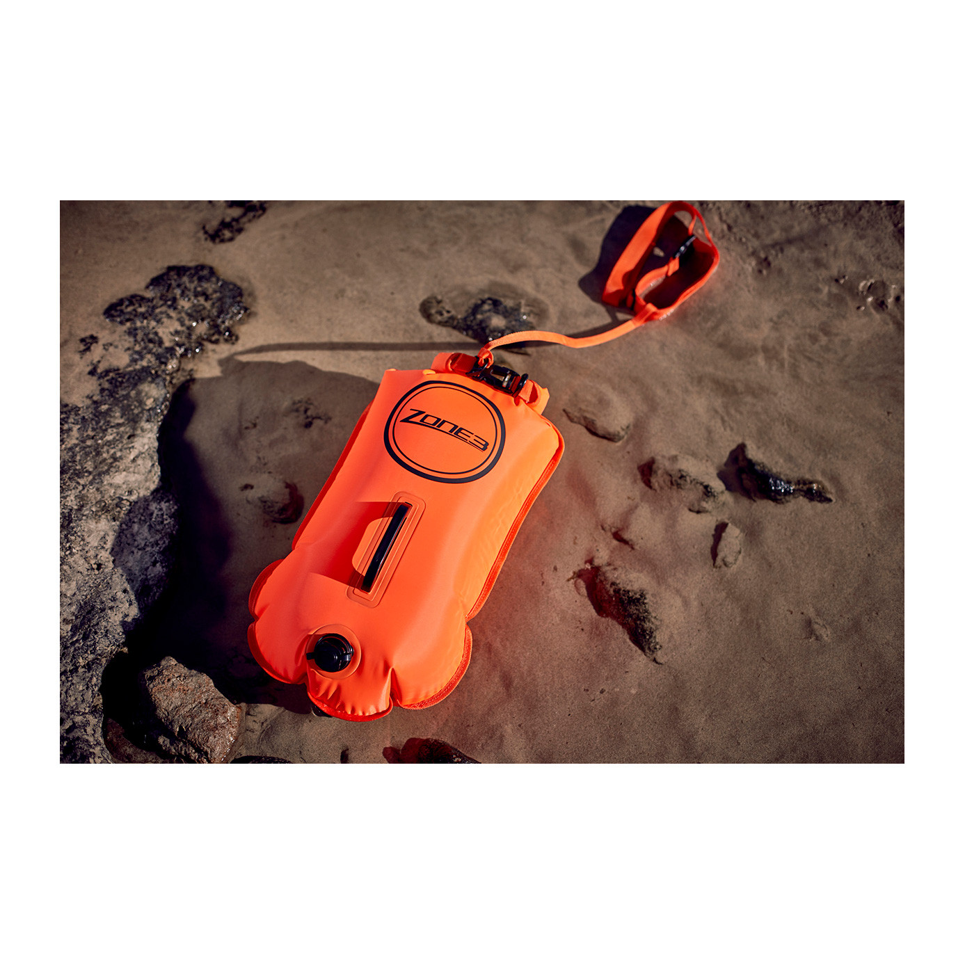 Although it doesn’t offer as much space as Zone3’s 28L bag option, it is extremely versatile. The brightly coloured inflatable dry bag is ideal for storing your important kit whilst you swim and for use as an inflatable buoy, for increased visibility in open water.
